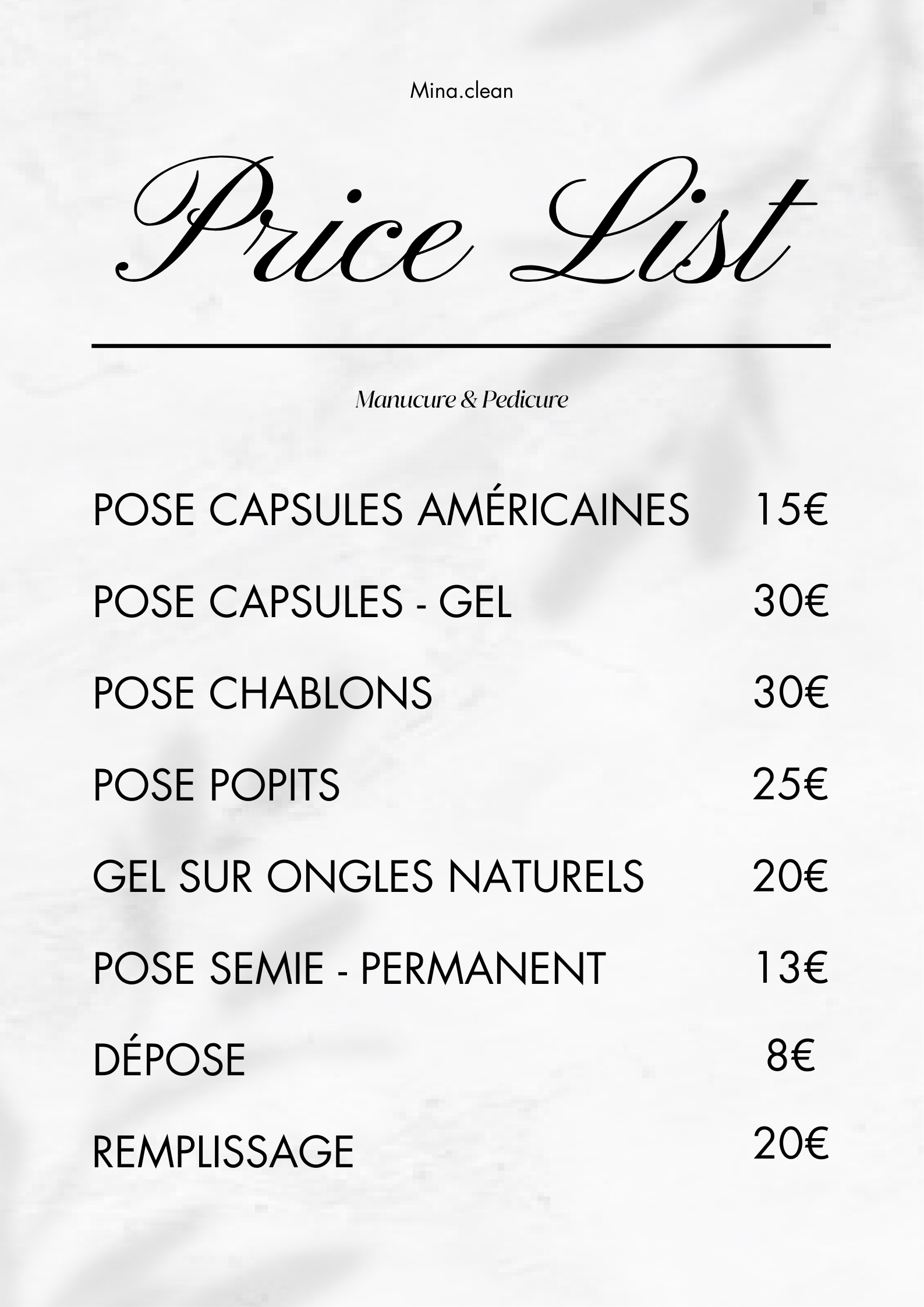 Nous proposons une gamme de poses spécialisées adaptées à vos envies. Mina.clean s'engage à vous offrir des prestations de qualité, réalisées avec soin et expertise. Profitez de nos tarifs de lancement exceptionnels jusqu'au 1er mai !